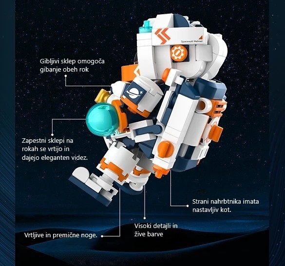 Mali astronavt iz serije Igra vesolja je premišljeno oblikovan figurativni komplet z barvnimi poudarki, gibljivimi sklepi in razpirajočim nahrbtnikom, visok približno 13 cm in sestavljen iz 302 kock je zasnovan za igro, razstavljanje in povezovanje z modeli Vesoljska postaja, Vesoljska raketa in Raziskovalni vesoljski raketoplan ter omogoča gradnjo dekoracije za dom, učilnico ali zbirko.🌌