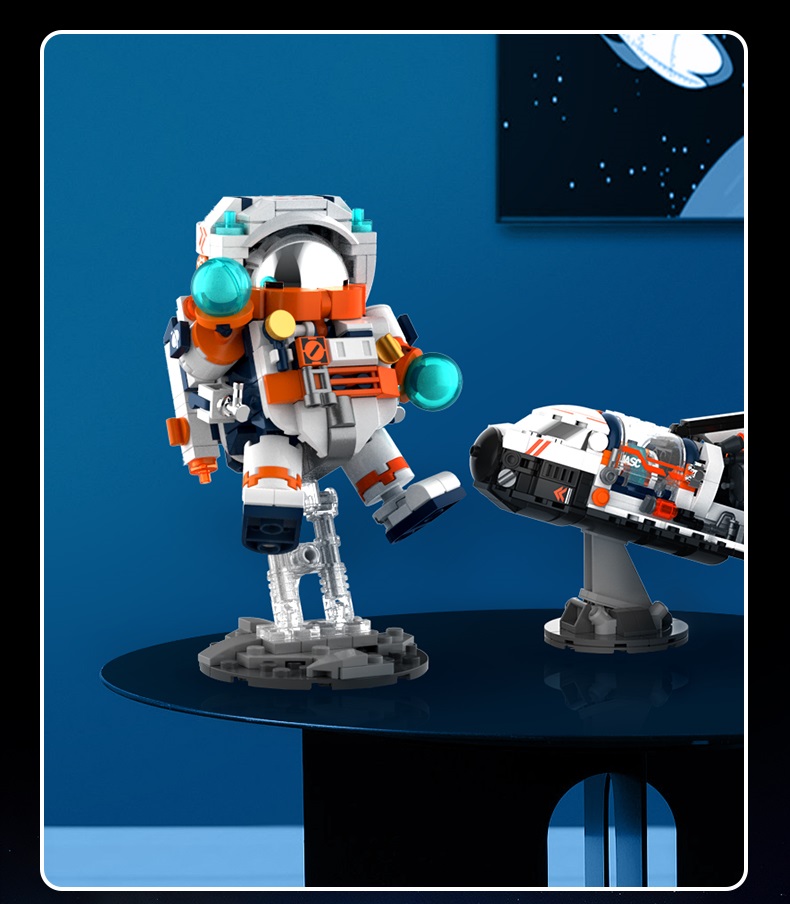 Mali astronavt je srce serije, pripravljen voditi misije, popravljati opremo ali raziskati lunine pečine, enostavno ga postavite pred Raziskovalni vesoljski raketoplan, Vesoljsko postajo ali Vesoljsko raketo, kjer prevzame vlogo pilota, inženirja ali raziskovalca. Združljivost s preostalimi kosi omogoča hitro sestavo celovite misijske scene in bogate, tekoče zgodbe.