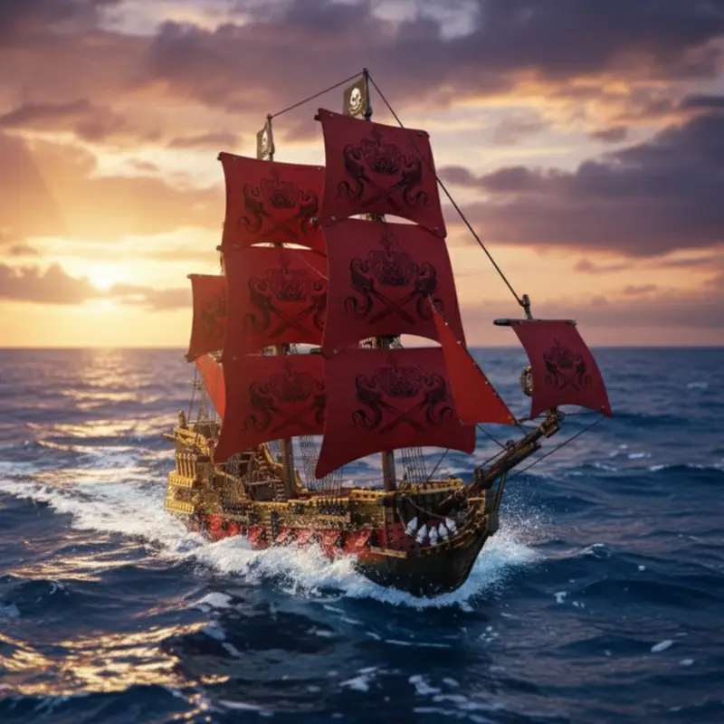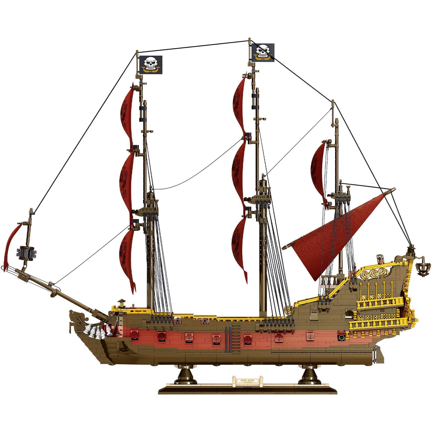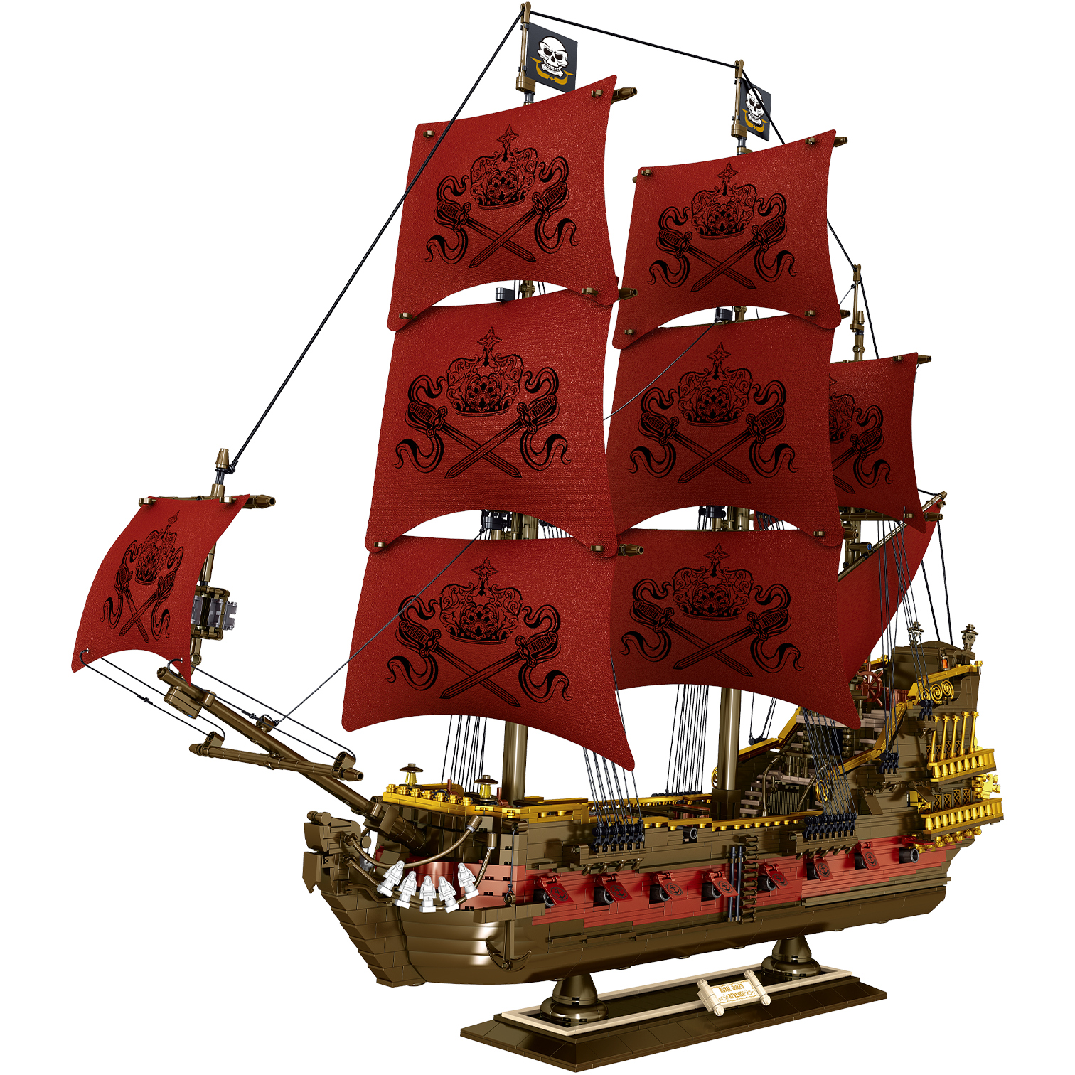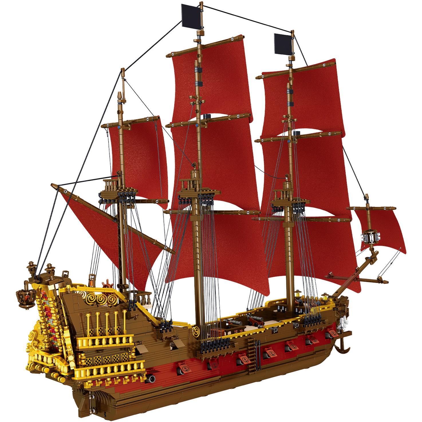 - Trup rdečo oblogo, z dekorativnimi jadri, jambori, zastavami in piratskimi simboli