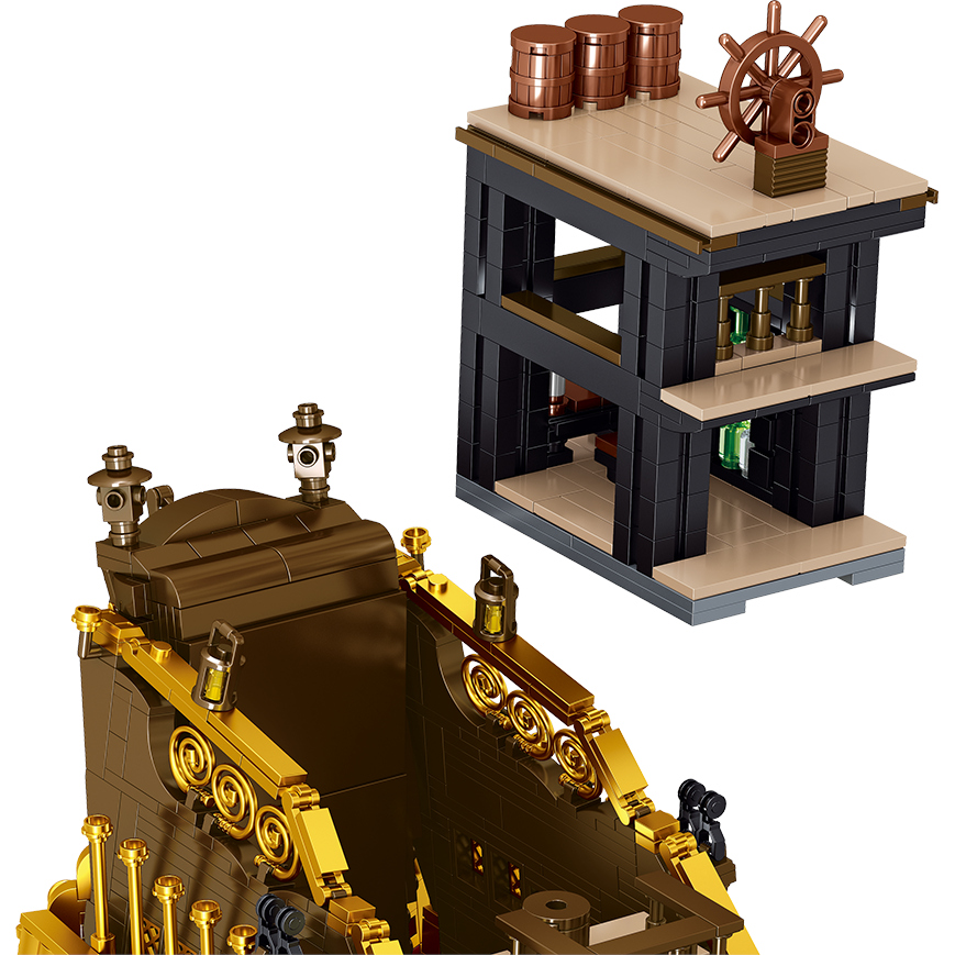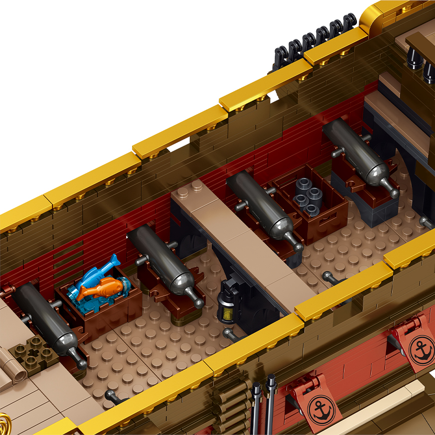 Posebnost tega modela je duplo dno, ki ga lahko odstraniš, da razkriješ notranjost ladje. Ta pametna rešitev omogoča vpogled v Podpalubje, kjer se skrivajo dodatni detajli in elementi, vse to brez potrebe po razstavljanju celotnega modela. Zasnovana iz kakovostnih kock in premišljene konstrukcije je ladja dovolj trpežna za igro, a hkrati dovolj natančna za razstavo.