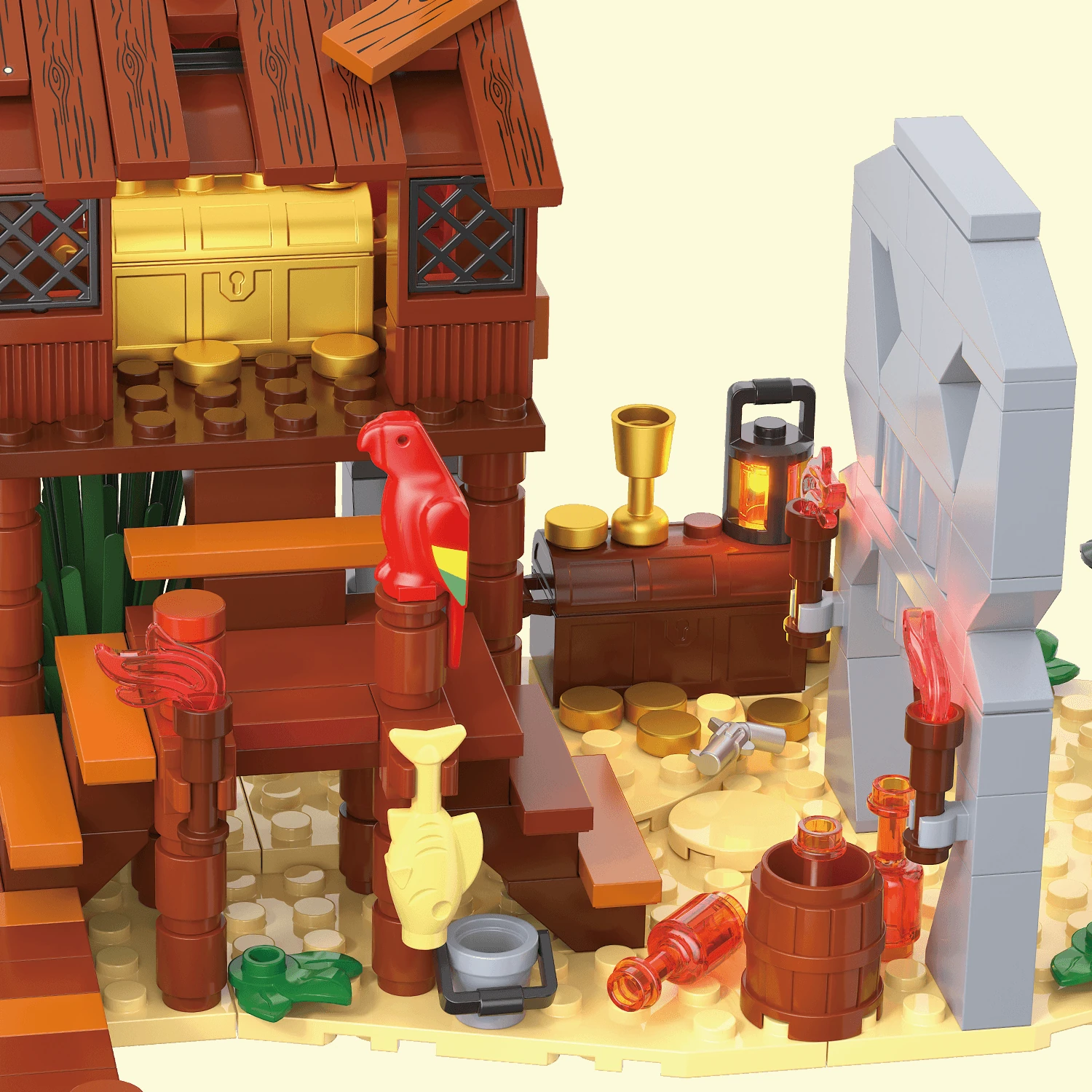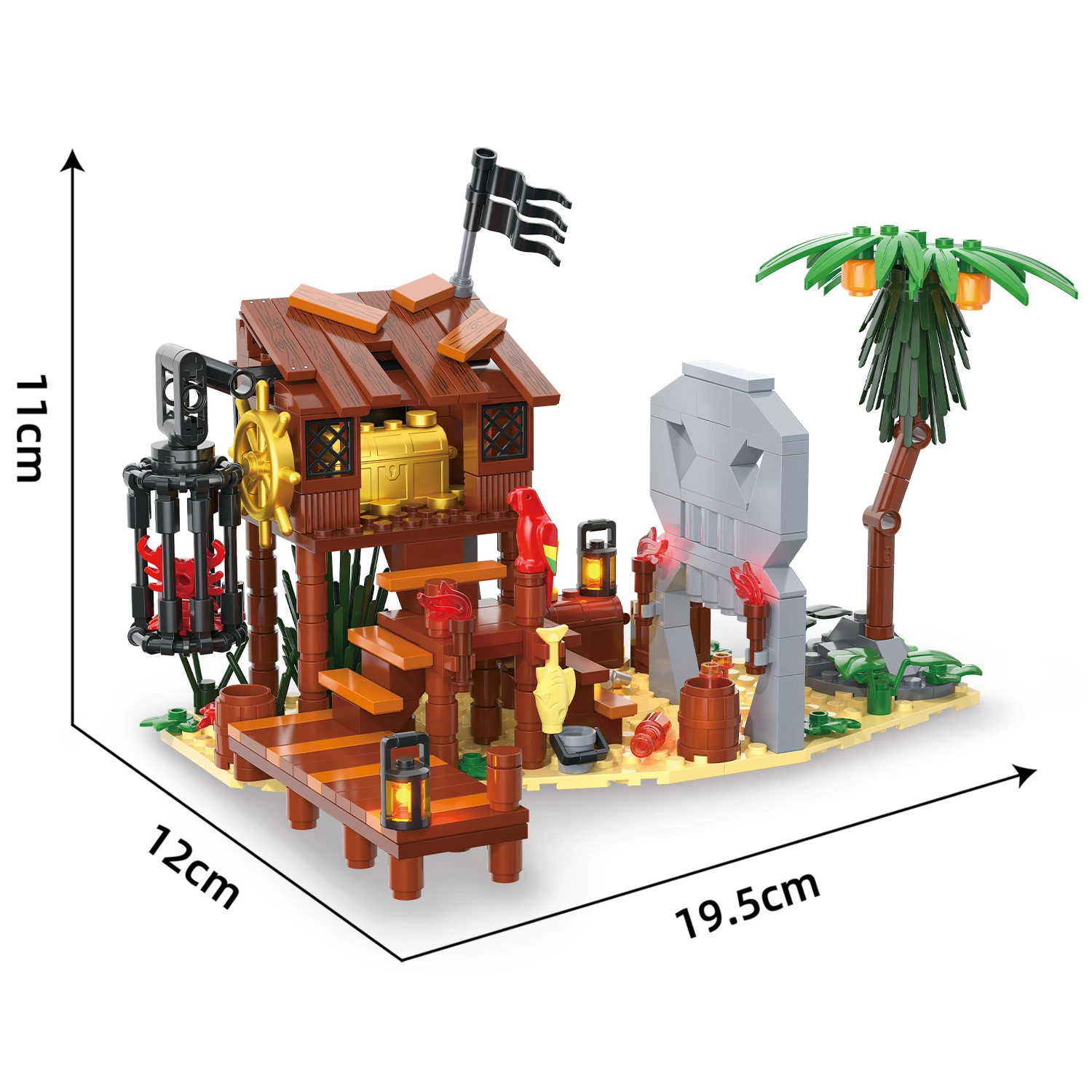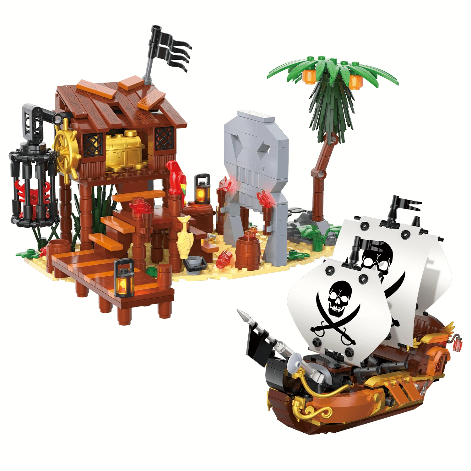 Na otoku te pričaka viseča ječa z ujeto pošastjo, kamnita lobanja kot vhod v skrivni rov, goreče bakle, mostovi in detajli, ki ustvarjajo občutek nevarnosti. Gusarska ladjica, zasidrana ob obali, je polna dodatkov — topovi, zastave, sidra in piratski simboli — pripravljena, da brani otok pred nepovabljenimi gosti.🏴☠️