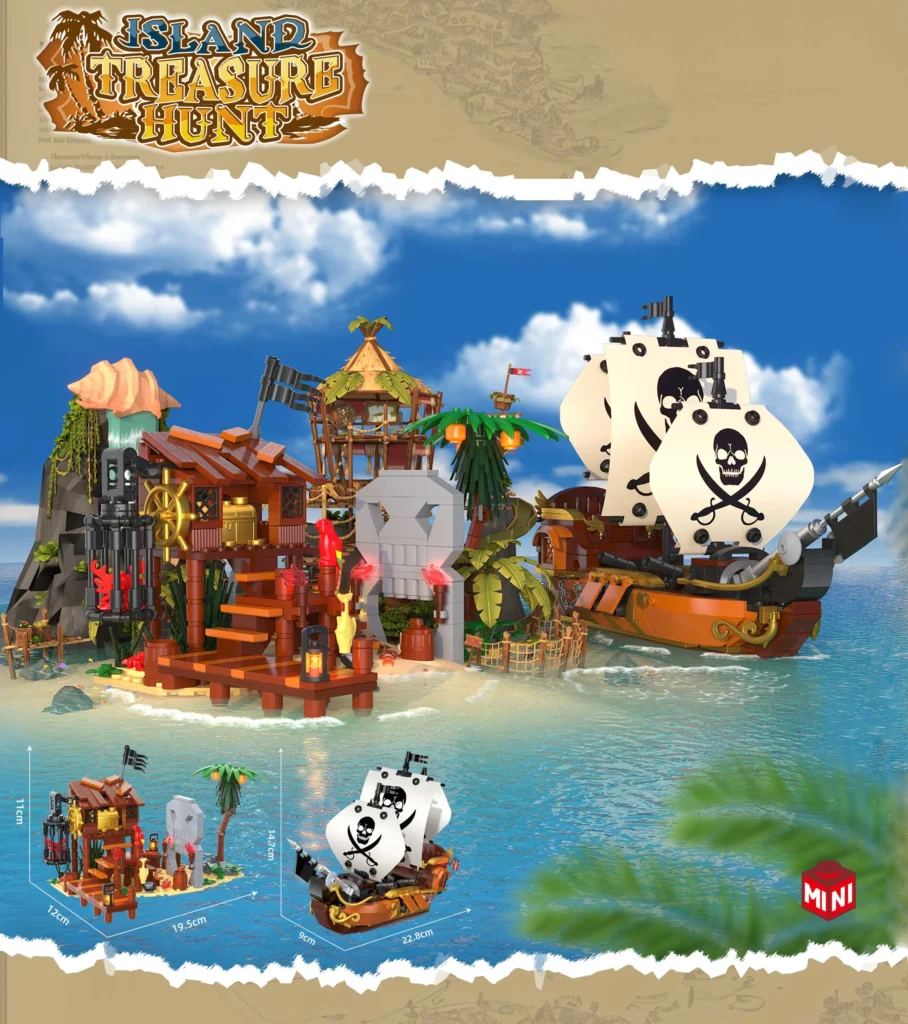 Otok lova na zaklad te popelje v svet skrivnosti, zakladov in piratskih legend je tematski model, ki združuje gusarsko ladjico, strašljivo otoško utrdbo in množico detajlov, ki pripovedujejo zgodbo o skritem bogastvu in nevarnostih, ki ga varujejo.🏝️💀🏴☠️