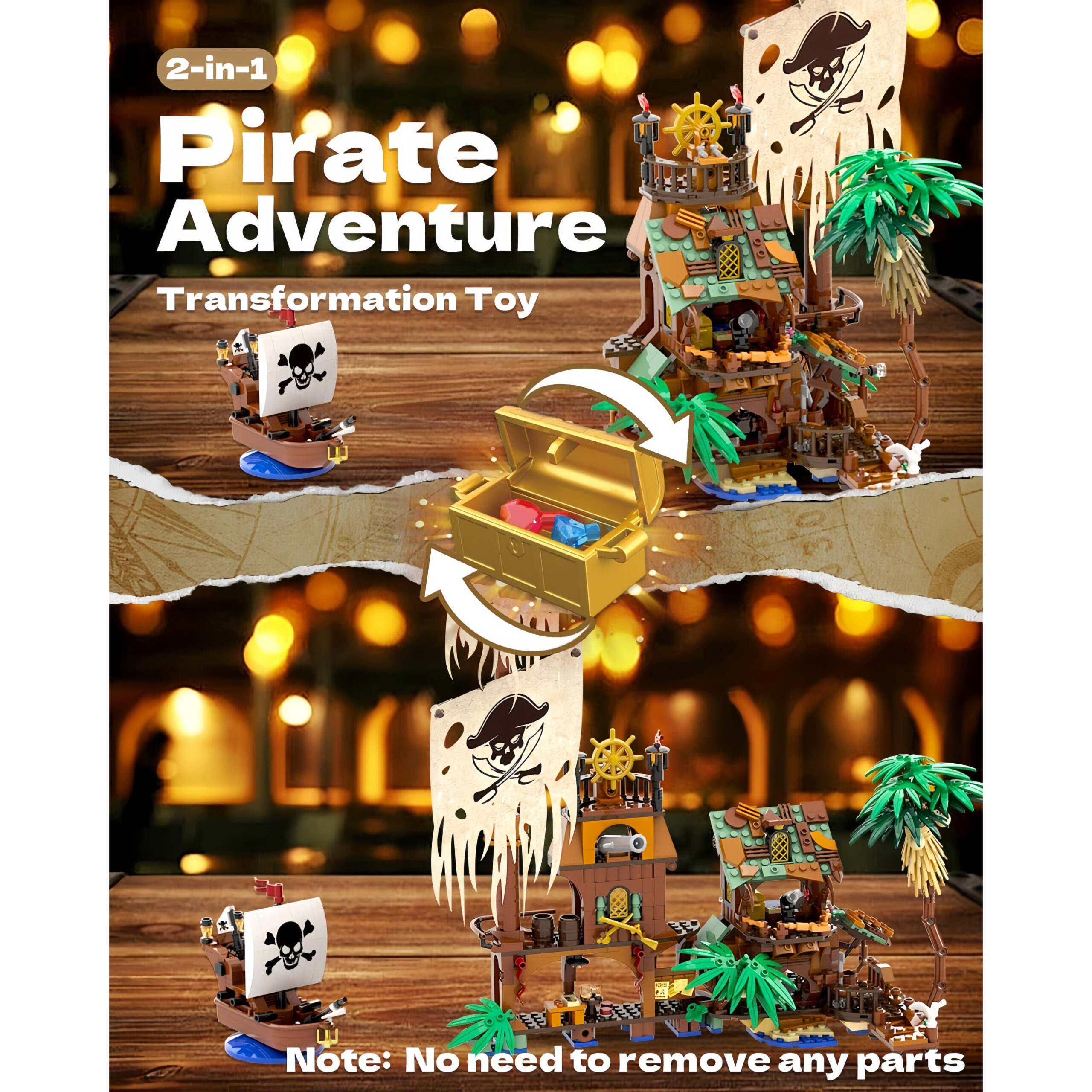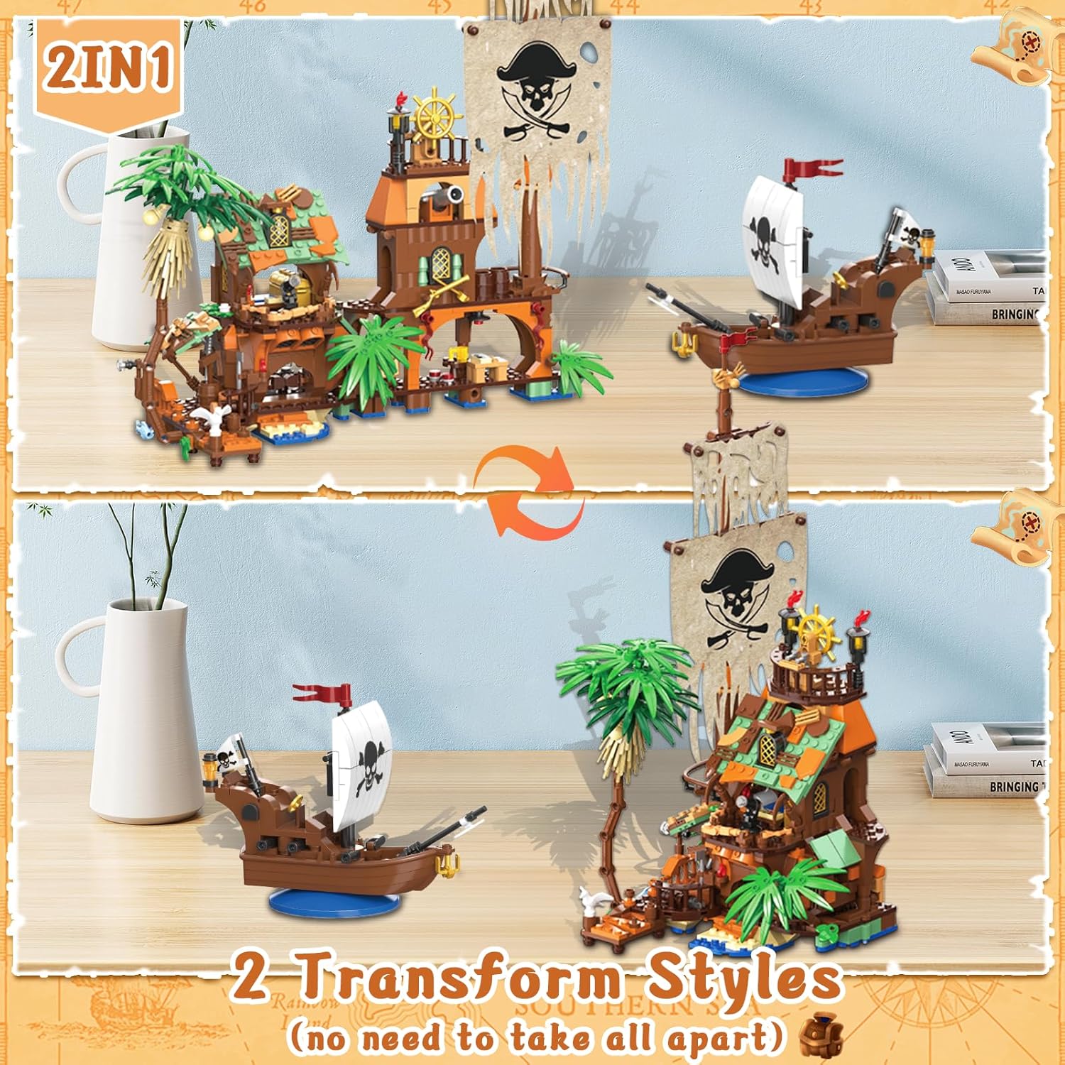 Preoblikuj svoj piratski pristan, ki se brez razstavljanja preoblikuje med Piratskim pomolom in Obalnim skladiščem z barom!