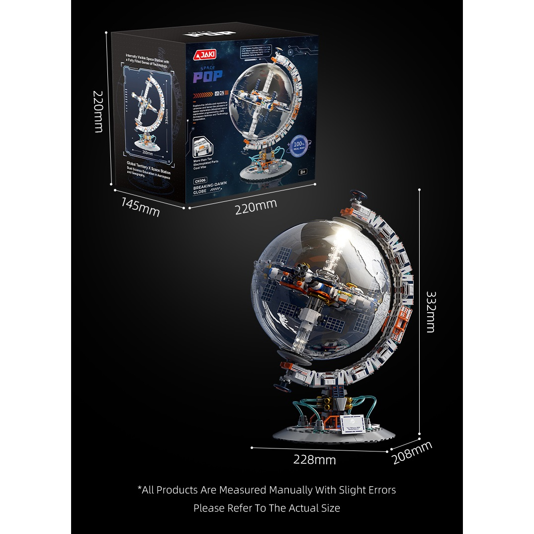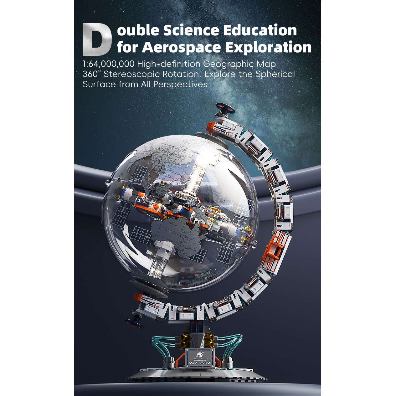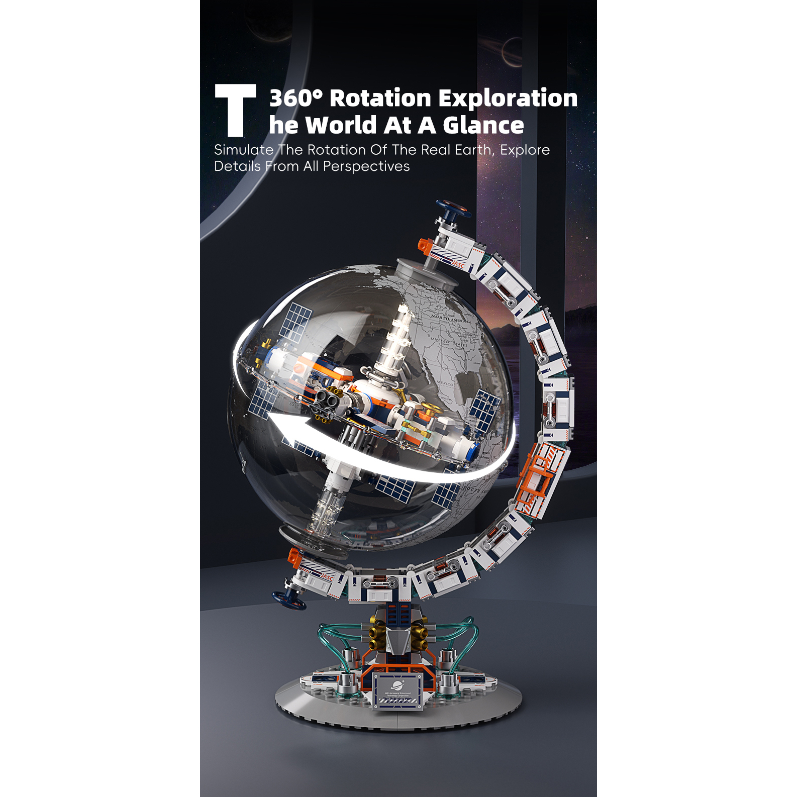 Ta inovativni komplet združuje vesoljsko postajo in rotacijski svetovni globus v prozornem ohišju, ki razkriva čudovito interstelarno pokrajino.