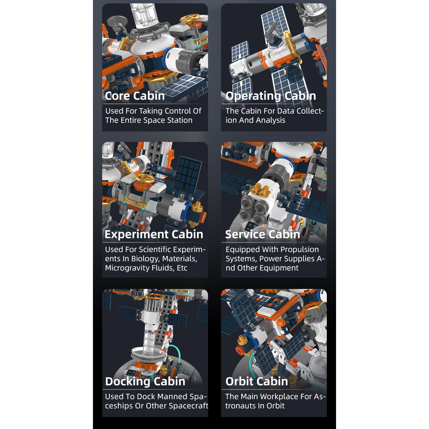 - Vesoljska postaja z moduli: delovni, eksperimentalni, servisni, orbitalni, pristajalni in jedrni, popolna simulacija življenja v vesolju
