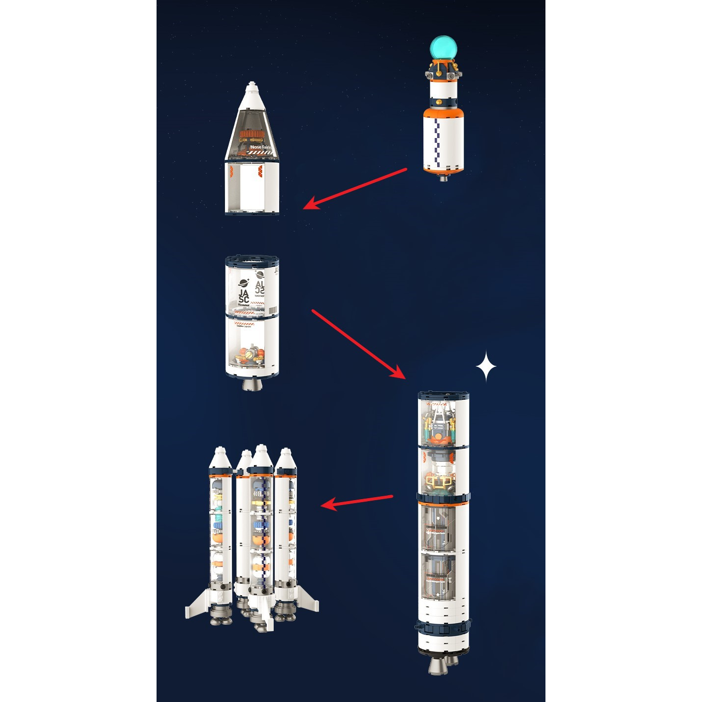 Celotna raketa je razdeljena na več prozornih modulov: Izhodna enota, Jedrni modul, Prva stopnja, Štiri dopolnilni ojačevalci, ki simulirajo delovanje večstopenjske rakete, vsak modul je zasnovan za preprosto sestavljanje, razstavljanje in ponovni priklop.