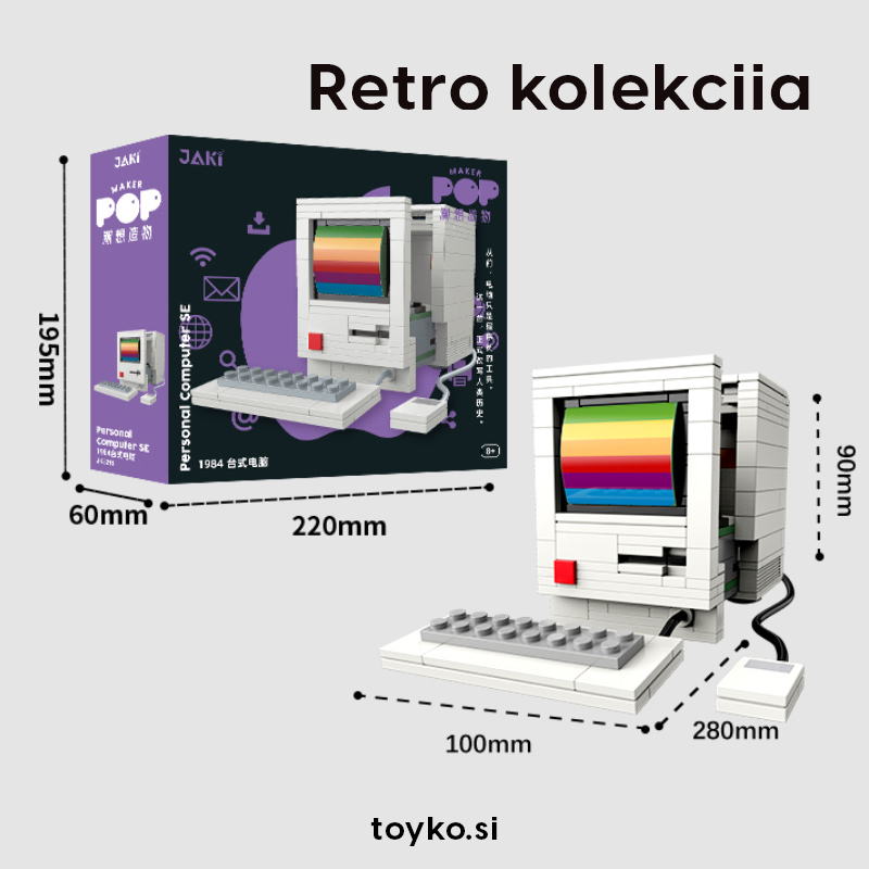 Retro računalnik prinaša čarobno nostalgično vzdušje priljubljenih računalnikov iz devetdesetih in je del prestižne “Retro” serije. Vsak element je skrbno zasnovan, da poustvari značilno obliko monitorja v nostalgični zelenkasti barvi in vsebuje nalepko z značilnim mavričnim vzorcem na zaslonu, disketnim pogonom in rdečim gumbom na sprednji strani. Izdelava modela prebudi spomine na prve dni osebnih računalnikov in hkrati navdihuje nove generacije graditeljev, da odkrijejo čare retro tehnologije 🙂.