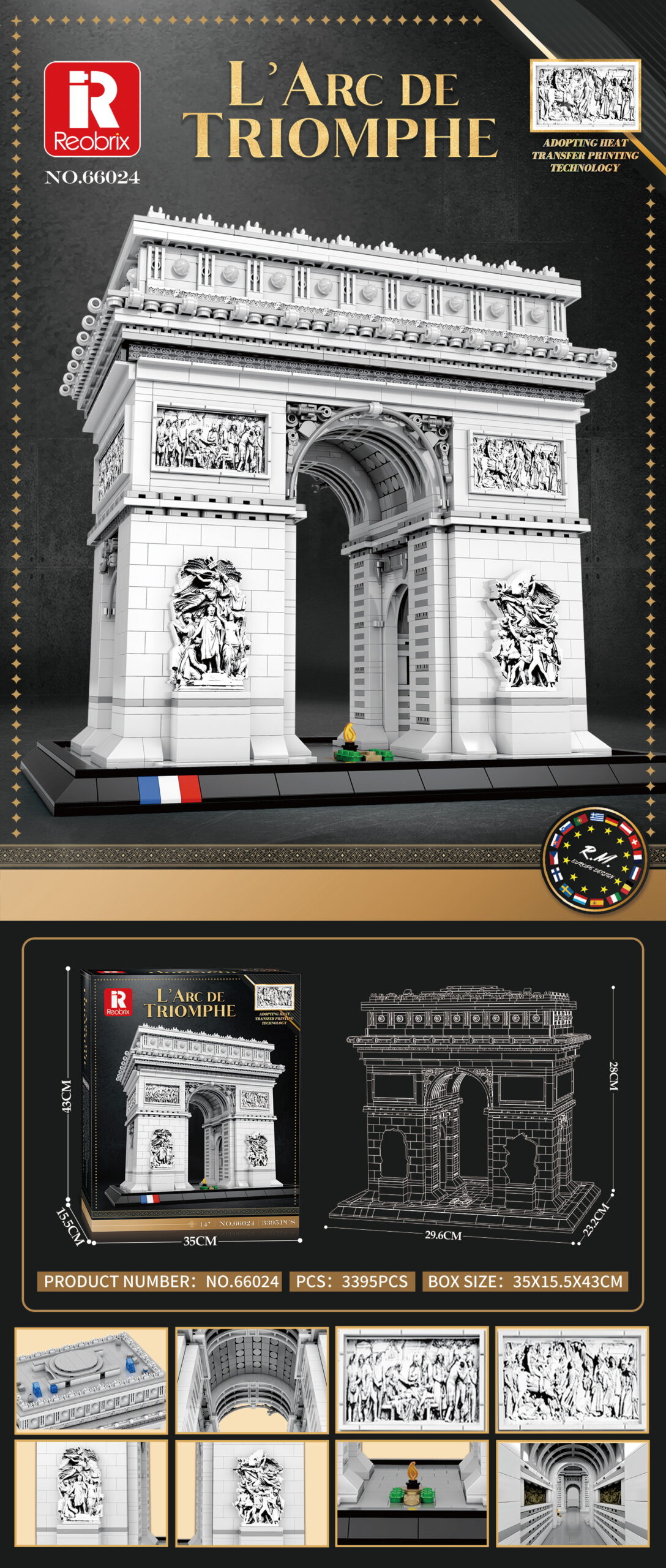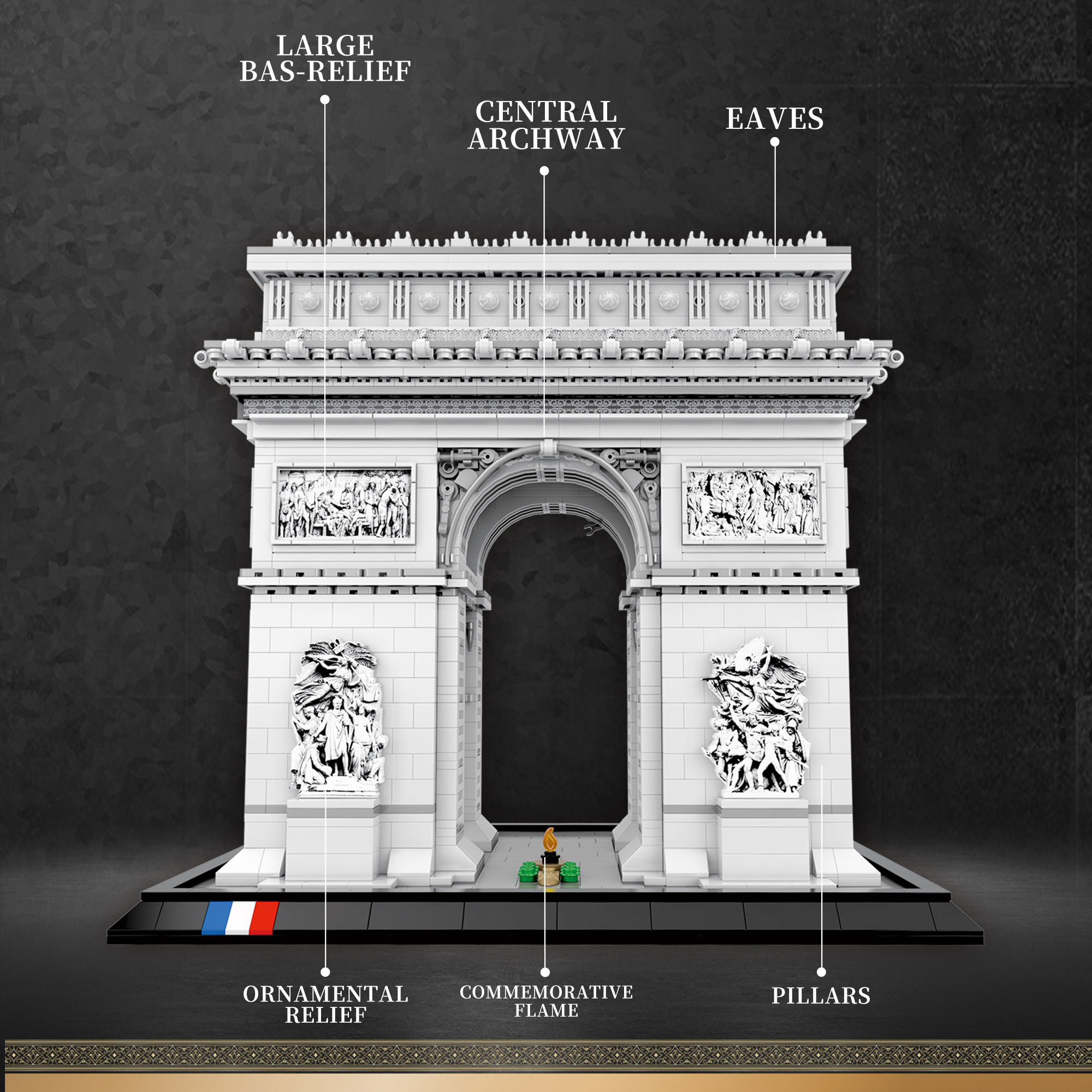 Model iz 3395 skrbno oblikovanih delov ujame ornamentiko in reliefne podobe originala, pri dnu pa nosi tribarvni motiv francoske zastave, premišljene nalepke pa poenostavijo sestavljanje, tako da je proces tekoč in ne le tehnična naloga, ampak miren, ustvarjalen ritual.