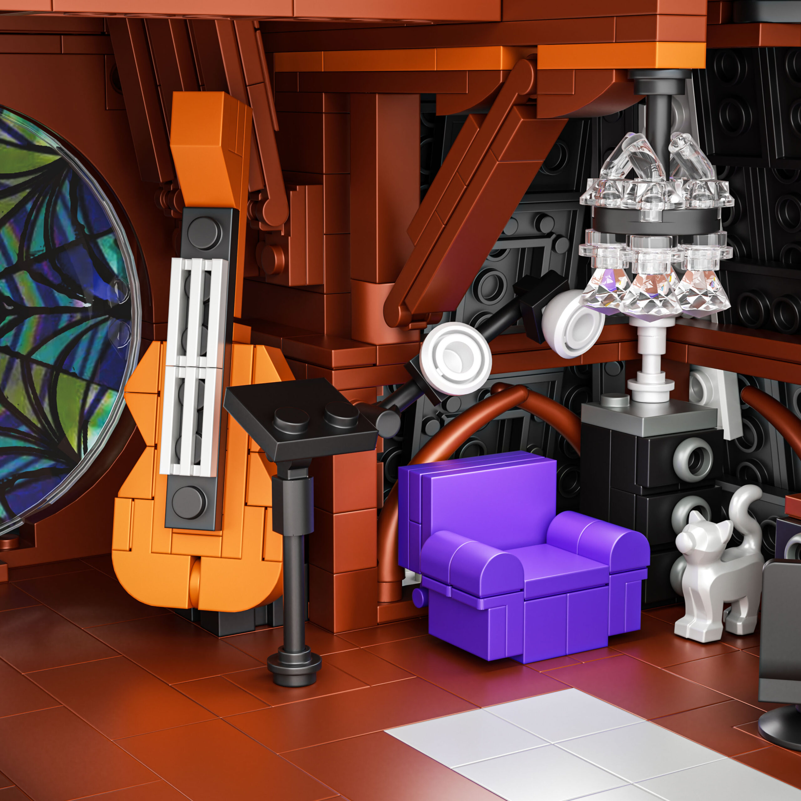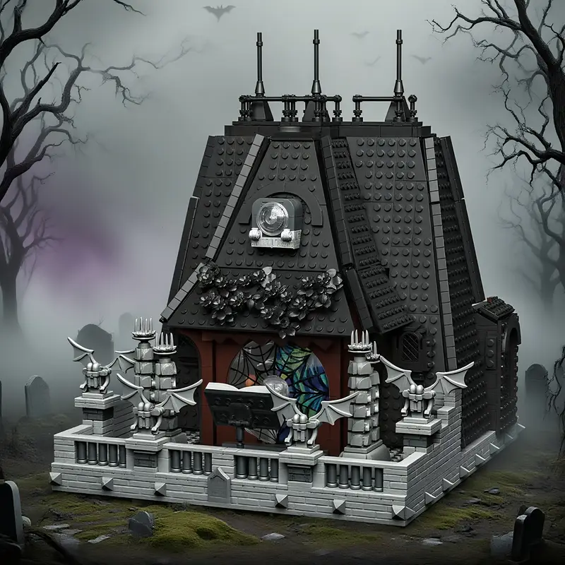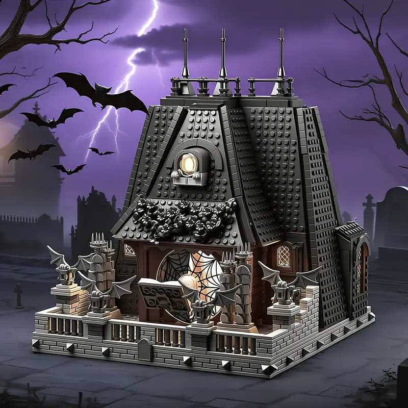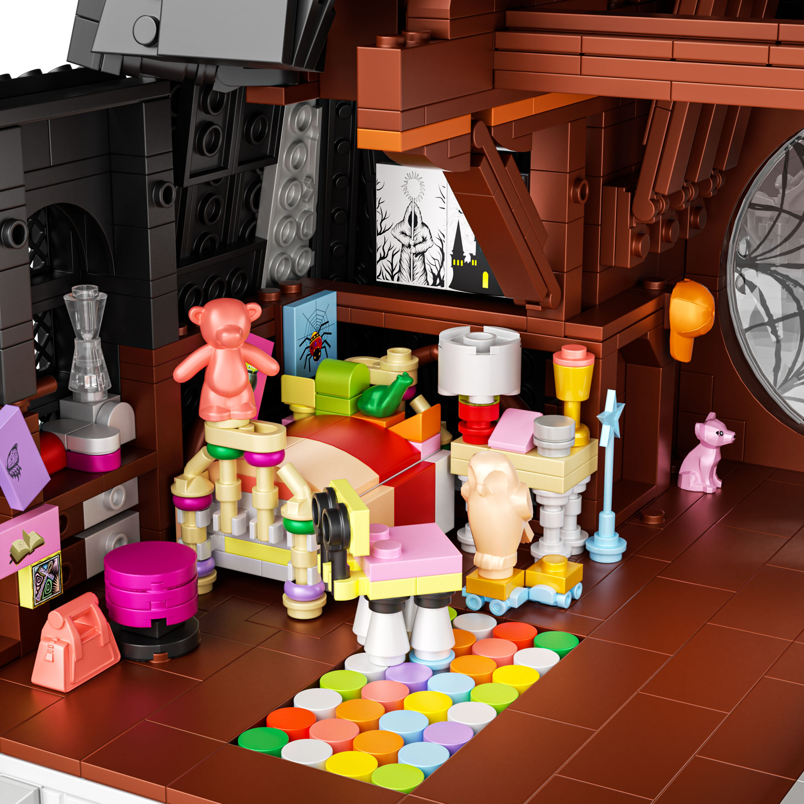 Ta edinstven gradbeni komplet iz 2419 kock poustvarja Sobo Wednesday – prostor, razdeljen med temačno eleganco in živahno ekscentričnost.