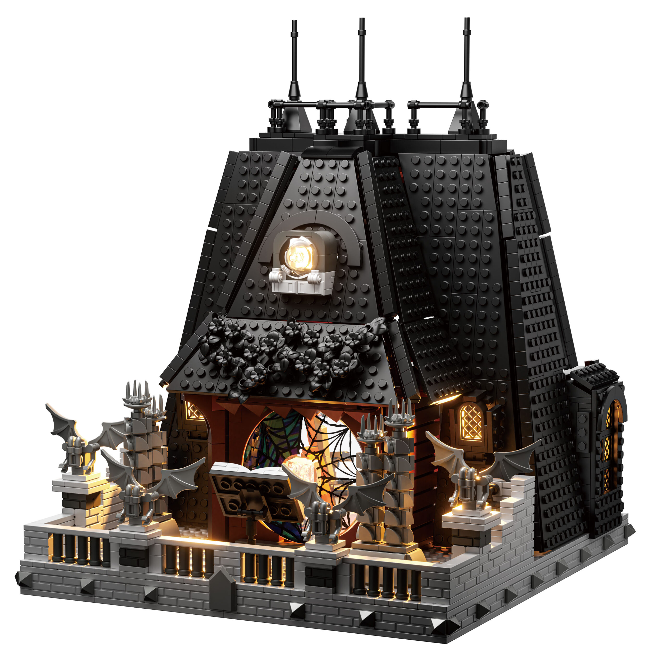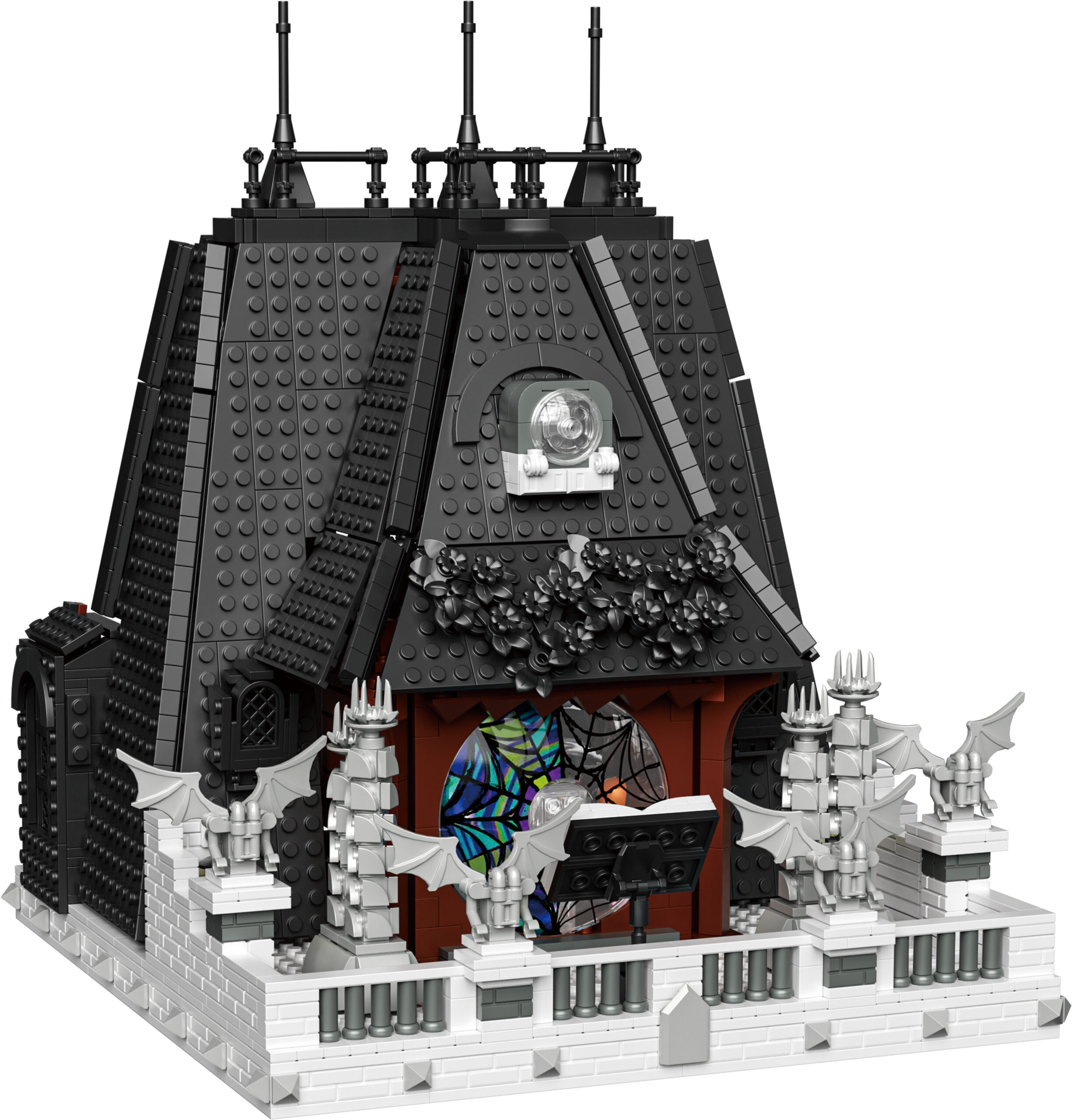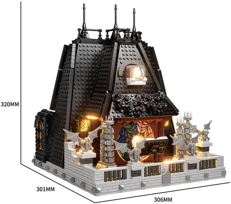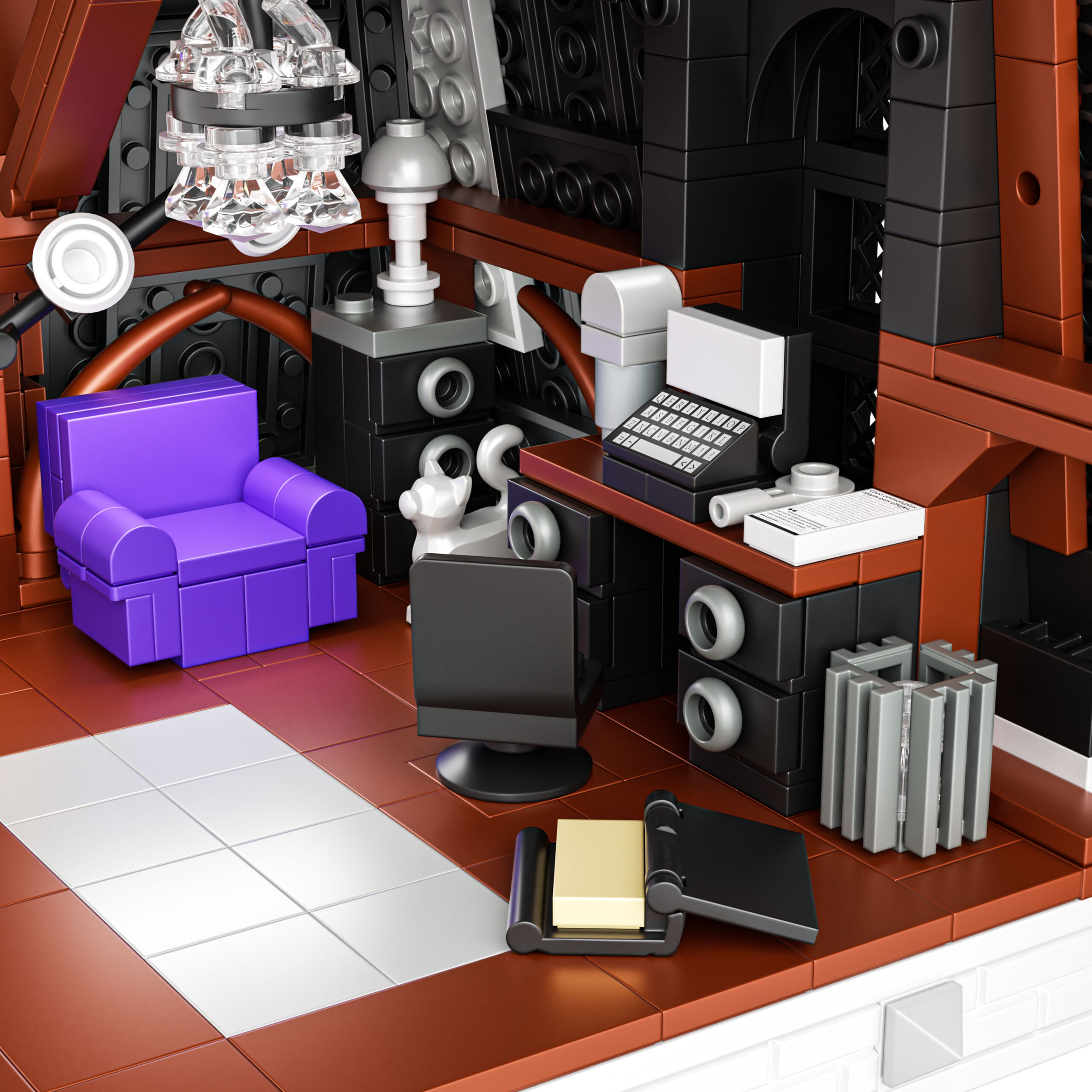 Ta edinstven gradbeni komplet iz 2419 kock poustvarja Sobo Wednesday – prostor, razdeljen med temačno eleganco in živahno ekscentričnost.