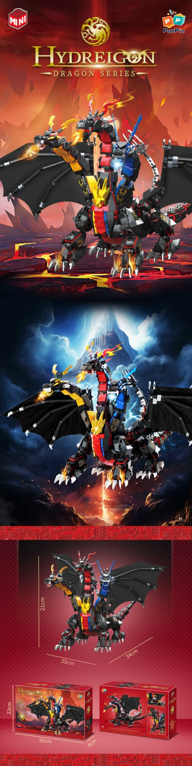 MINI kocke omogočajo izjemno natančne detajle, popolno razmerje velikosti pa poudari njegovo držo in ga naredi temnega zmajskega kralja, osupljiv razstavni kos za ljubitelje fantazije in mitoloških bitij.🐉🔥