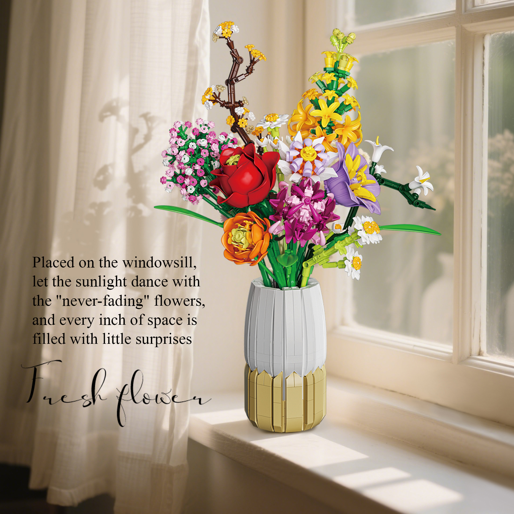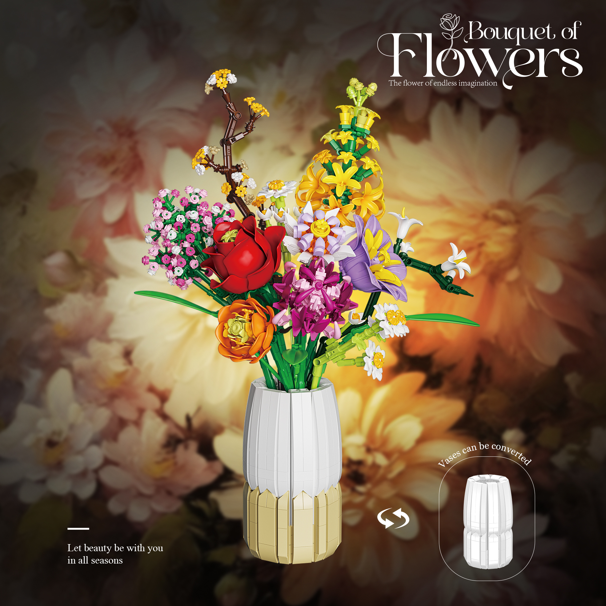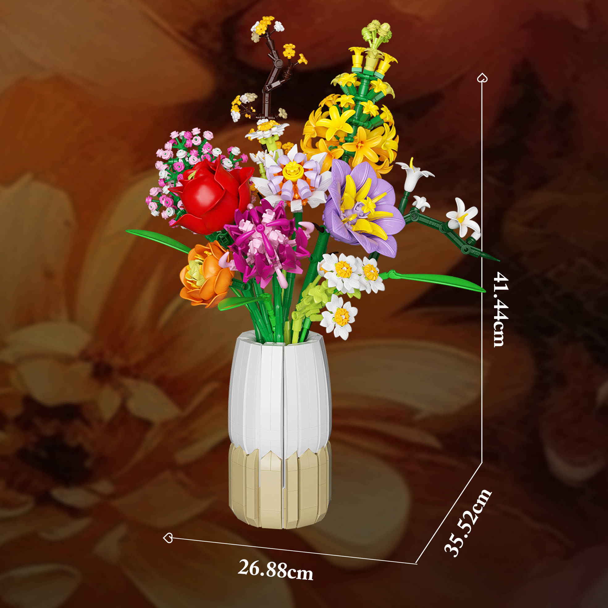 💐Vaza šepet cvetja je eleganten botanični komplet s 1458 kockami, ki združuje deset ikoničnih cvetlic v 41 cm visoki dvobarvni vazi.